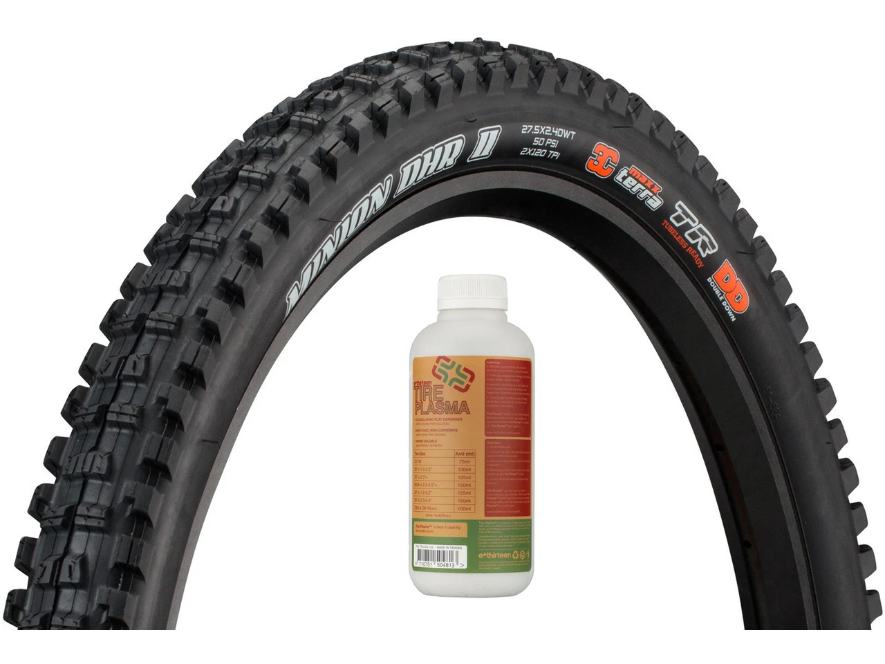 La cubierta plegable Maxxis Minion DHR II 3C MaxxTerra DD WT TR 27,5″ en un set con el sellador de cubiertas e*thirteen Tire Plasma